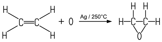erfolgt durch die Oxidation von Ethen mit Sauerstoff an einem Silberkontakt bei etwa 250 °C unter Druck: