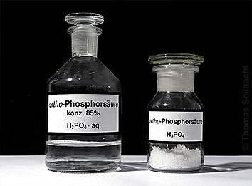 Die übliche Phosphorsäure des Handels für den Laborbedarf ist eine 85%-ige Lösung in Wasser. Konzentrierte Phosphorsäure ist keine so starke Säure wie konzentrierte