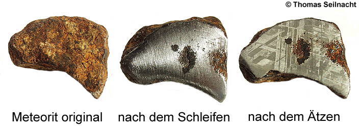Eisen steht mit 4,7% an vierter Stelle der Elementhäufigkeit in der Erdhülle. In der Natur kommt es in gediegener Form sehr selten vor. In Meteoriten ist es häufig enthalten. Zu den bedeutenden Eisenerzen zählen der Hämatit, der Magnetit, der Siderit oder das Gestein Limonit, das hauptsächlich aus den Mineralien Goethit und Lepidokrokit aufgebaut ist. Die bedeutendsten Erzvorkommen liegen in China, Australien, Brasilien, Indien, Russland oder in der Ukraine. In Deutschland kommen Eisenerze im Lahn-Dill-Gebiet in Hessen oder bei Salzgitter vor. Die Erzreserven werden weltweit auf über 115 Milliarden Tonnen geschätzt. Das Bild unten zeigt einen Eisen-Meteoriten, der in Gibeon, in Namibia gefunden wurde und vor ungefähr 30000 Jahren auf der Erde einschlug. Sein Alter wird auf 4,5 Milliarden Jahre geschätzt. Er enthält neben Eisen einen Nickel-Anteil von 6,8 Prozent, einen Cobalt-Anteil von 0,4 Prozent und einen winzigen Iridium-Anteil. Nach dem Schleifen wird der metallische Charakter des Meteoriten sichtbar. Nach dem Ätzen mit 5%iger alkoholischer Salpetersäure treten die für einen Meteoriten typischen „Widmannstättenschen Gefüge“ sichtbar. Es handelt sich dabei um eine Mischung mehrerer Eisen-Modifikationen. Die beim nickelarmen α-Eisen ausgebildeten Balken werden seitlich von nickelreichem γ-Eisen („Bandeisen“) begrenzt. Sind die beiden Eisen-Modifikationen nach dem Oktaeder verwachsen, erhält man nach dem Ätzen die beschriebenen Figuren: