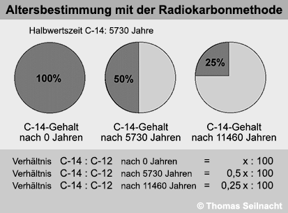erhalten bleibt. Die Halbwertszeit von C-14 beträgt 5730 Jahre. Innerhalb dieses Zeitraums hat sich die Hälfte des Isotops C-14 durch