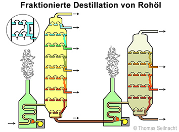 Im Röhrenofen wird das Rohöl auf über 360 °C erhitzt, so dass die Bestandteile weitgehend verdampfen. Diese gelangen in den Destillationsturm, der aus zahlreichen Glockenböden aufgebaut ist. In den Glockenböden sammeln sich die Destillate der einzelnen Fraktionen. Nach oben nehmen die Temperaturen der Glockenböden ab. Der aufsteigende Dampf wird im Gegenstrom zur kondensierten Flüssigkeit in Kontakt gebracht. Dieses Verfahren nennt man Rektifikation. Dabei kondensieren alle Stoffe, die einen höheren Siedepunkt besitzen, als die Flüssigkeit im Glockenboden. Der Rückstand wird in einer Vakuumdestillation erneut bei niedrigem Druck fraktioniert. Bei 350 °C würden viele Kohlenwasserstoffe zerfallen. Der niedrige Druck bewirkt eine Siedepunkterniedrigung, so dass dies verhindert wird. Die bei der ersten Destillation unter Normaldruck abgetrennten Gase wie Methan, Ethan, Propan und Butan sind wichtige Heizgase. Die Leicht- und Schwerbenzine (30 °C bis 180 °C) dienen als Ottokraftstoff für Kraftfahrzeuge. Das Mitteldestillat (180 °C bis 250 °C) wird zu Lampen-Petroleum oder zu dem Düsenkraftstoff Kerosin verarbeitet. Das Heizöl wird zum Heizen in Ölbrennern oder als Dieselkraftstoff eingesetzt. Bei der nachfolgenden Vakuumdestillation des Rückstands erhält man weitere wichtige Erdölprodukte. Das schwere Heizöl dient als Brennstoff für Kraftwerke oder Schiffsmotoren. Die Schmieröle eignen sich als Schmierstoffe für Motoren und Getriebe. Der unlösliche Rückstand Bitumen dient als Anstrichstoff und vor allem als Straßenteer zum Bau von Straßen. Serienbilder zur fraktionierten Destillation von Rohöl