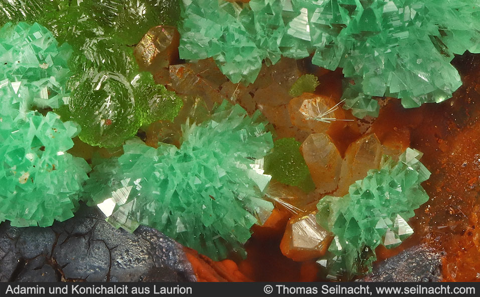 Adamin ist ein toxisches Zink-Arsen-Mineral. Reiner Adamin wäre farblos, meistens ist er aber durch Fremdbeimengungen gefärbt. Kupfer-Ionen färben den Adamin grün, Eisen-Ionen gelb. Die Spaltbarkeit ist im Gegensatz zum ähnlichen Olivenit erheblich besser. Viele Adamine zeigen unter langwelligem UV-Licht eine grüne Fluoreszenz. Der Adamin wird wie alle Arsenate durch Säuren angegriffen, er löst sich aber im Gegensatz zum Olivenit nicht in Ammoniaklösung. Vor dem Lötrohr zersetzt er sich unter Bildung toxischer Arsenverbindungen.
