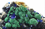 Azurit gefunden wird. Manche der tiefblauen Kristalle sind transparent oder sie bilden in blockiger Form kugelige Gebilde. Die früher als „Pseudomalachit“ bezeichneten Stücke sind wohl eher Pseudomorphosen von