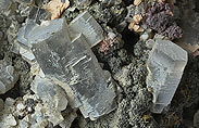 Stromeyerit in blaugrau glänzenden Aggregaten. Proustit und Xanthokon sind chemisch gleich aufgebaut. Der rote
