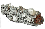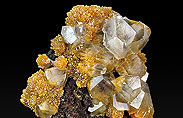 Calcit oder auf gelb- bis rotbraunem Limonit sitzend. Extrem farbenprächtig sind auch die Kombinationen aus orangem