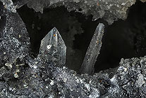 Quarz bildet klare Kristalle, auch Fadenquarze kommen vor. Er ist häufig mit farblosem oder gelblichem