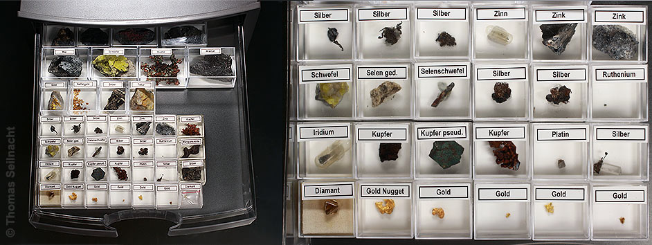 Mineralien unterbringen Die erworbenen Mineralien sollen natürlich so ausgestellt werden, damit jeder Besucher sie bewundert. Man kann Regale selbst bauen. Aber auch die Vitrinenbauer bieten an den Börsen sehr gute Ausstellungsmöbel an. Als Beleuchtung eignen sich kaltweiße LED-Lampen. Tauschstücke werden in gut stapelbaren Pappschachteln oder in Döschen aus Kunststoff untergebracht. Jedes Mineral wird mit dem Namen und der Fundstellenangabe versehen. Man kann auch Nummern vergeben oder den Namen des Besitzers anbringen. In einem Karteikartensystem oder einer Liste können die erworbenen Stücke der Sammlung den Nummern zugeordnet werden. Als Klebeetikette für die Mineralien eignen sich weiße, gut haftende Strukturbänder. Es wird empfohlen, für jedes Mineral aus der Sammlung ein individuell gestaltetes Kärtchen anzufertigen. Dies erhöht den Wert. Auch die Angabe einer Referenz, von wem und wo das Stück erworben wurde, ist für eine seriöse Sammlung von Bedeutung. Beispiel-Kärtchen: doc docx pdf Im Handel ist ein Kitt zum Befestigen von Mineralien in Dosen erhältlich. Dieser sollte allerdings nur sehr spärlich eingesetzt werden, da der Kitt die Kleinstufen verkleben kann. Die Etiketten für Dosen können aus der hier angebotenen Druckvorlage erstellt werden. Sie eignen sich für alle Micromount-Döschen. Empfehlenswert sind wetterfeste Etiketten-Druckbögen, aus denen die Etiketten dann ausgeschnitten werden. Das kleine Etikett kommt auf die Vorderseite, das größere auf die Rückseite des Döschens. Druckvorlage für Dosen-Etiketten: doc docx pdf ![]() Problematische Mineralien Markasite gelten als problematisch, da sie Gase abgeben, die andere Mineralien zersetzen können. Sie müssen separat aufbewahrt werden. Toxische und krebserzeugende Mineralien wie Adamin, Auripigment, Erythrin, Mimetesit, Konichalcit, Krokoit oder Realgar und asbesthaltige Mineralien wie Aktinolith, Amiant oder Chrysotil müssen in verschlossenen Dosen untergebracht werden. Für Kinder sind diese Minerale zum Sammlen nicht geeignet. Stark radioaktive Mineralien wie Autunit oder Pechblende dürfen nicht in Wohn- oder Arbeitsräumen aufbewahrt werden. Sie gehören in eine luftdichte Dose, die sich in einem strahlungsdichten Behälter befindet. Das Sammeln gefährlicher Mineralien ist problematisch. Grundsätzlich sollte das Bearbeiten von gefährlichen Mineralien im Freien stattfinden, dabei werden Schutzbrille, Schutzhandschuhe und eine Staubschutzmaske getragen. Mineralien bestimmen Die Sammlung kann mit einer Software geordnet und mit Fotos dokumentiert werden. Am einfachsten ist die Verwendung einer Excel-Datei. Unerlässlich ist auch ein Bestimmungswerk, wie das hier vorliegende. In deutscher Sprache sind zwei Zeitschriften von Bedeutung: Lapis und Mineralienwelt. Hervorzuheben sind auch die Lapis-Extra-Ausgaben mit ausführlichen Mineralien- oder Fundstellenportraits. In der Schweiz berichtet der „Schweizer Strahler“ von neuen Funden. Internet Lapis Mineralienwelt Schweizer Strahler Zubehör: http://www.krantz-online.de |
